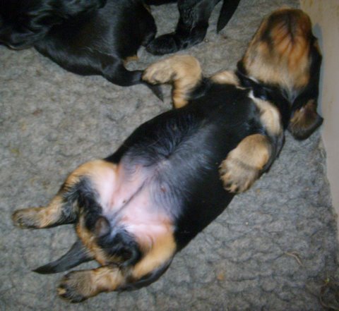 Nach einer unruhigen Vollmondnacht wurden am 31.01.2010 zwischen 11:50 Uhr und 13:30 Uhr Yasmins 5 Sonntagskinder geboren. Der Vater der Welpen ist der schwarz mit loh-Rüde High Sonnyboy vom Marschenland. Mutter und Kinder sind wohlauf und gedeihen prima. Es sind 1 Rüde und 1 Hündin schwarz mit loh, sowie 1 Rüde und 2 Hündinnen schwarz. Weitere Bilder folgen in regelmäßigen Abständen.